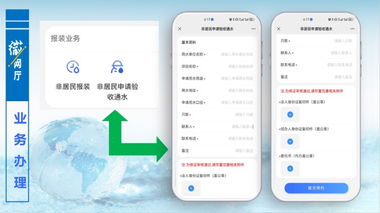 當(dāng)用水施工完成,達(dá)到通水條件,用戶同樣可在“微網(wǎng)廳”中,辦理驗(yàn)收通水申請,填寫相關(guān)信息,上傳附件,提交預(yù)約,后臺(tái)工作人員會(huì)主動(dòng)聯(lián)系用戶,進(jìn)行驗(yàn)收通水。