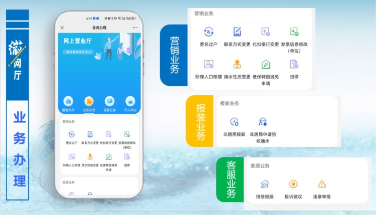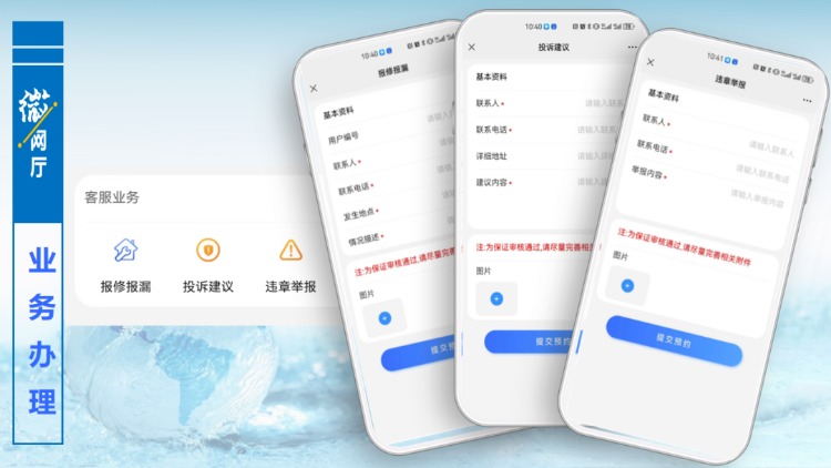 客服業(yè)務(wù)版塊主要是針對報(bào)修報(bào)漏,只要提交相關(guān)信息,工作人員會(huì)及時(shí)與用戶取得聯(lián)系進(jìn)行處理。“微網(wǎng)廳”已開通投訴建議通道,對用戶提出的投訴和建議,將會(huì)第一時(shí)間進(jìn)行回復(fù)和處理,同時(shí)歡迎大家對身邊的違章用水現(xiàn)象進(jìn)行舉報(bào)。