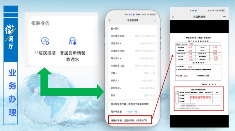 用戶可在報(bào)裝業(yè)務(wù)版塊中申請獲得用水。進(jìn)入報(bào)裝業(yè)務(wù)版塊,下載用水審批表,按照示例圖片,完善表格內(nèi)容,再拍照上傳,填寫好相關(guān)信息及附件,提交預(yù)約后,由后臺(tái)工作人員接單,進(jìn)入辦理流程,流程完結(jié),告知申請人是否滿足接水條件,完成報(bào)裝申請。